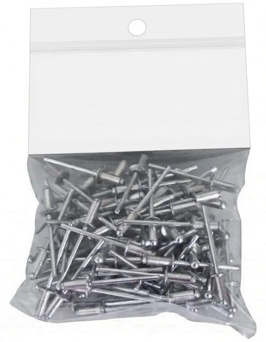 Professional-grade aluminum blind rivets for sheet metal assembly. 100-piece pack with steel mandrels. Ready-to-stock resale item.