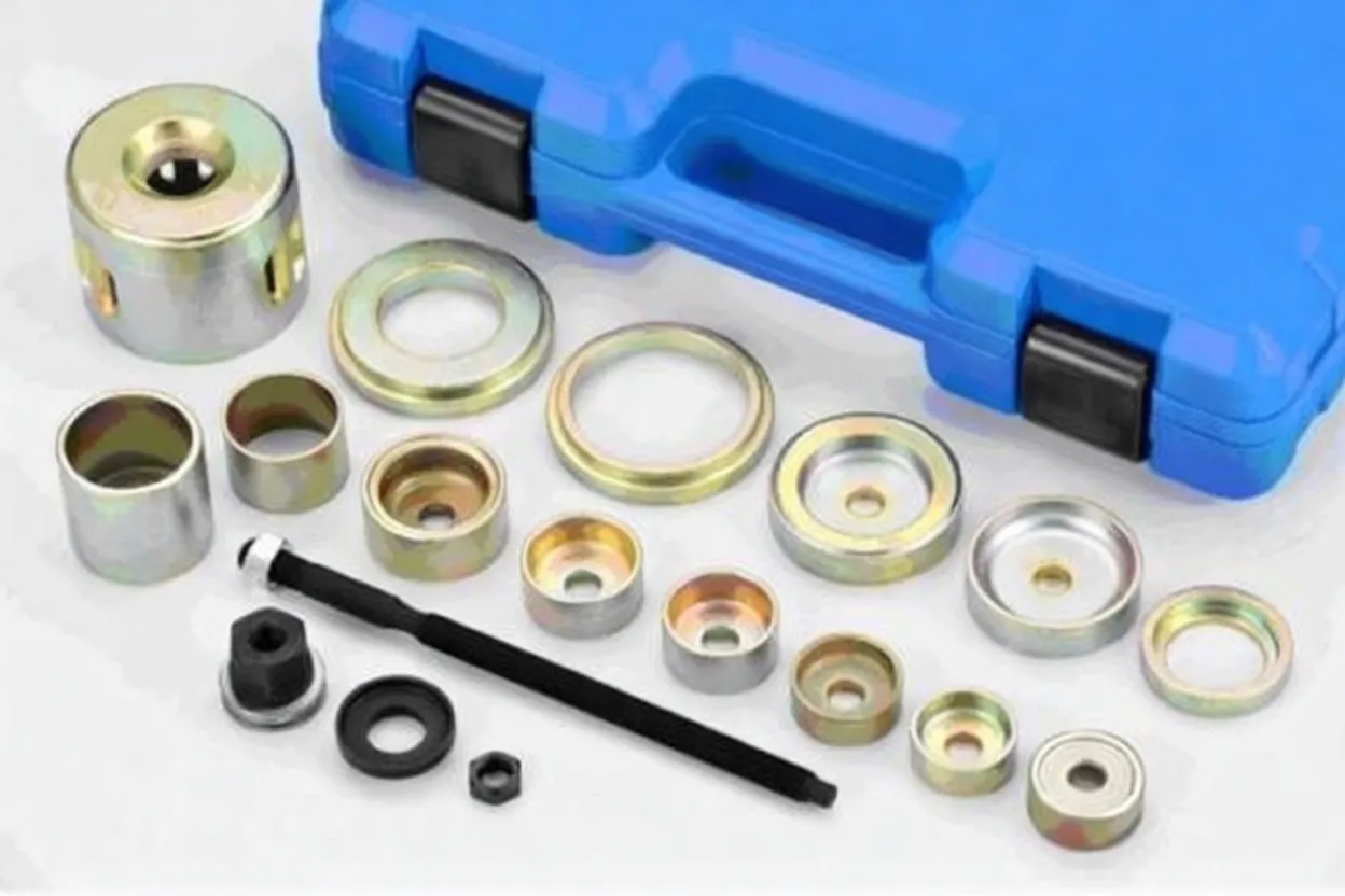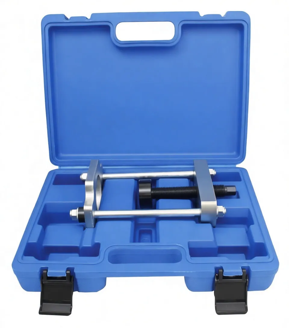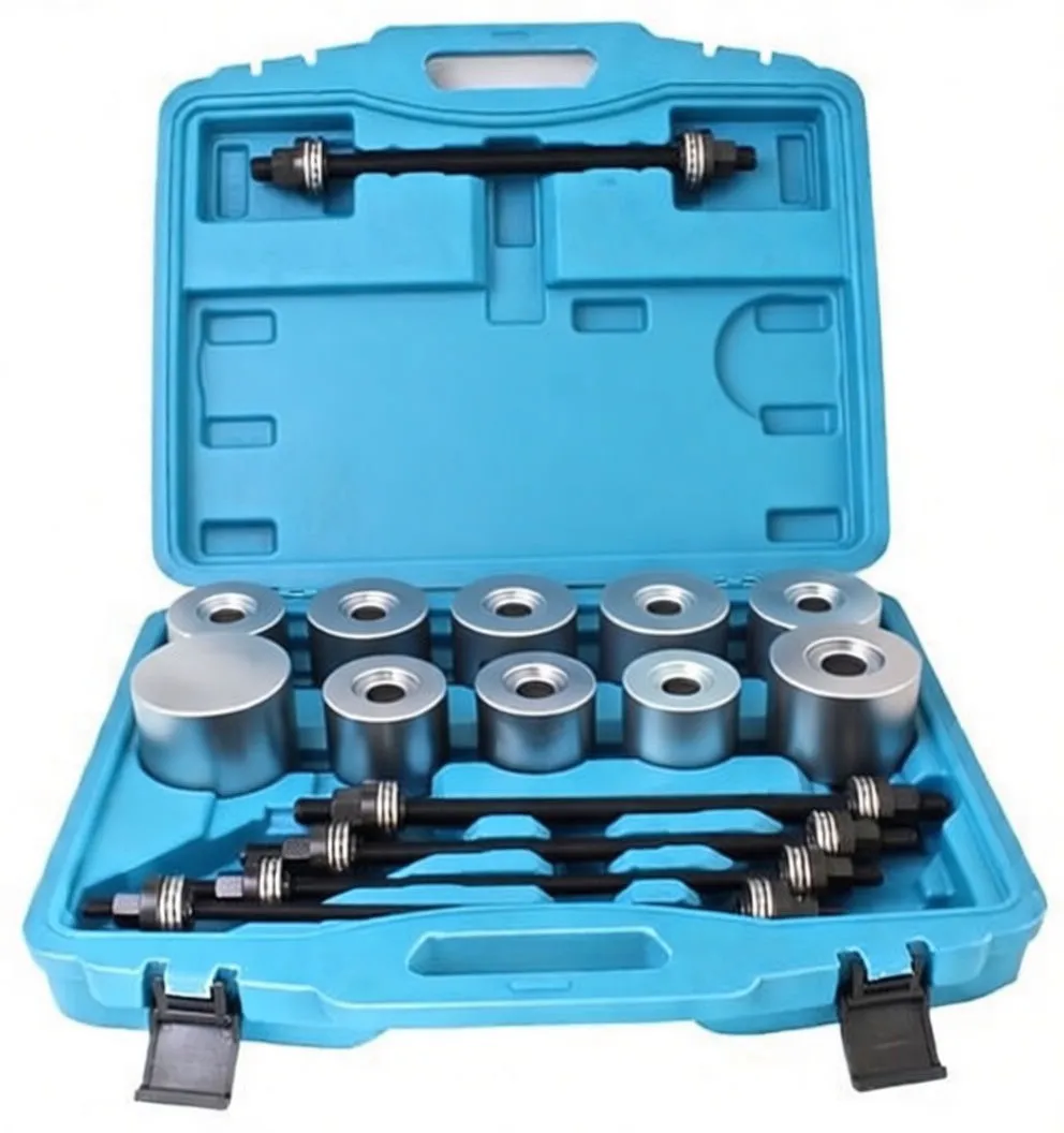 Universal bearing and bush removal/installation kit with 20 press sleeves and 4 pulling spindles for automotive and heavy commercial work.