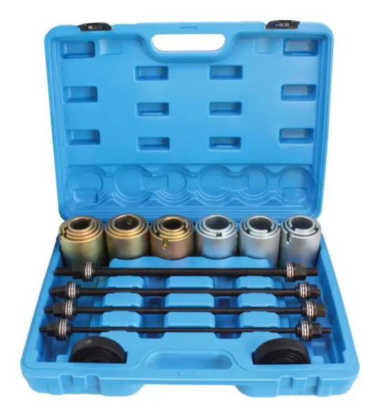 Professional-grade bush removal and installation set for VAG front suspension work. Includes precision adapters, extraction rods, and carrying case.