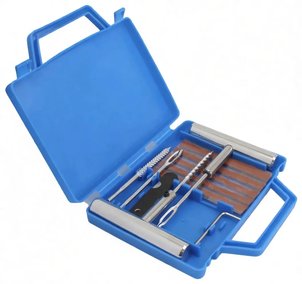 Complete emergency tire repair kit with 20 plugs, reaming tools, and insertion needles. Professional-grade for cars, trucks, motorcycles, and off-road vehicles.