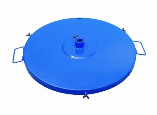 Steel drum cover for 350mm openings with secure clamping system, central pour spigot, and ergonomic handles.