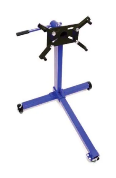 Heavy-duty engine mounting stand with 360° rotating head and mobile base. 700 kg capacity for efficient workshop positioning and assembly.