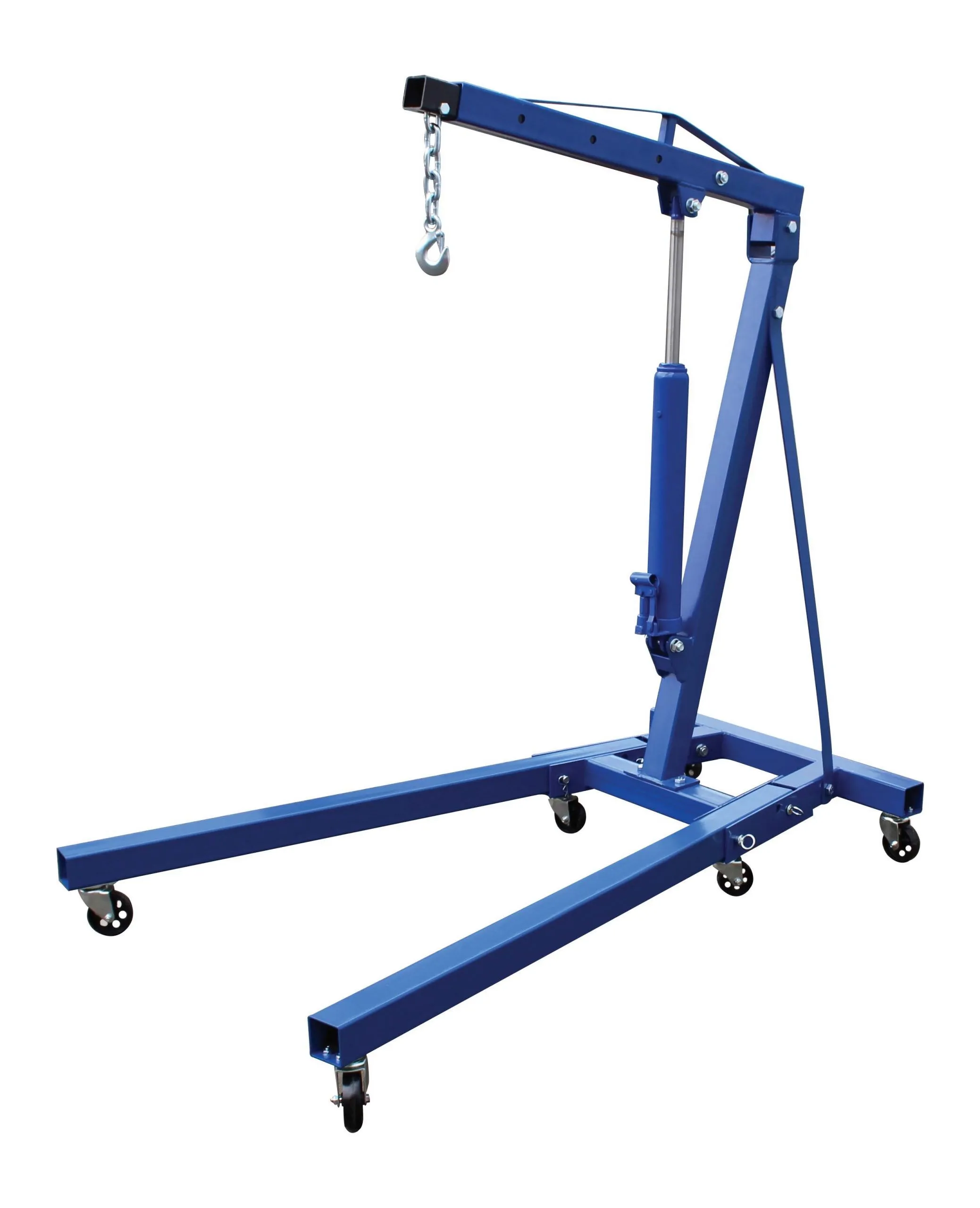 Robust 2-ton shop crane with adjustable arm height, folding legs, and heavy-duty hydraulic lift—ideal for automotive repair and engine work.
