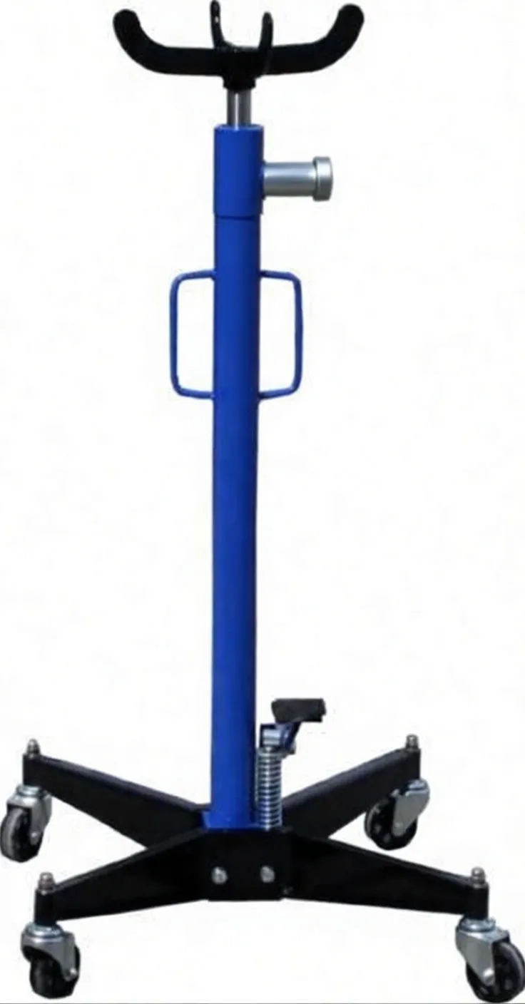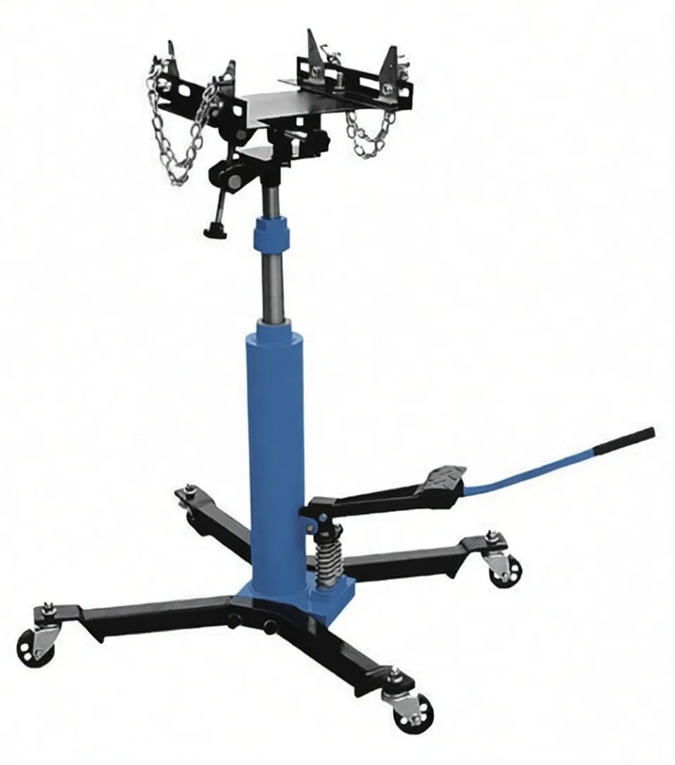 Stable, mobile gearbox support jack with foot pump steering and wide base—ideal for transmission work in automotive shops.