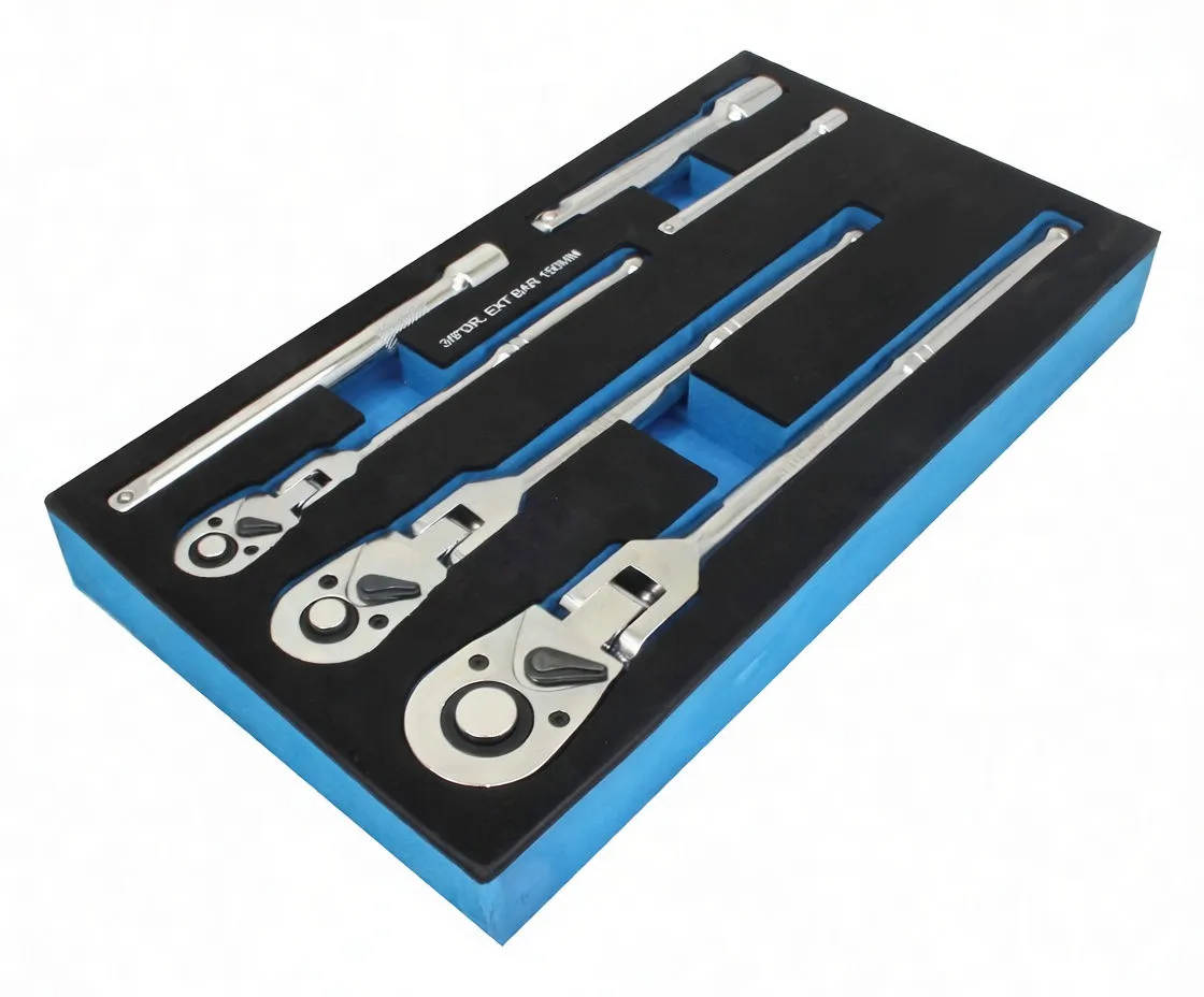 Professional flex-head ratchet set with quick-release extensions for tight-space repairs. Chrome Cr-V construction with 72-tooth mechanism.