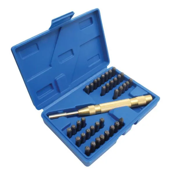 Professional 38-piece stamp set with automatic brass punch for permanent marking on metal, wood, and leather. Adjustable impact force.