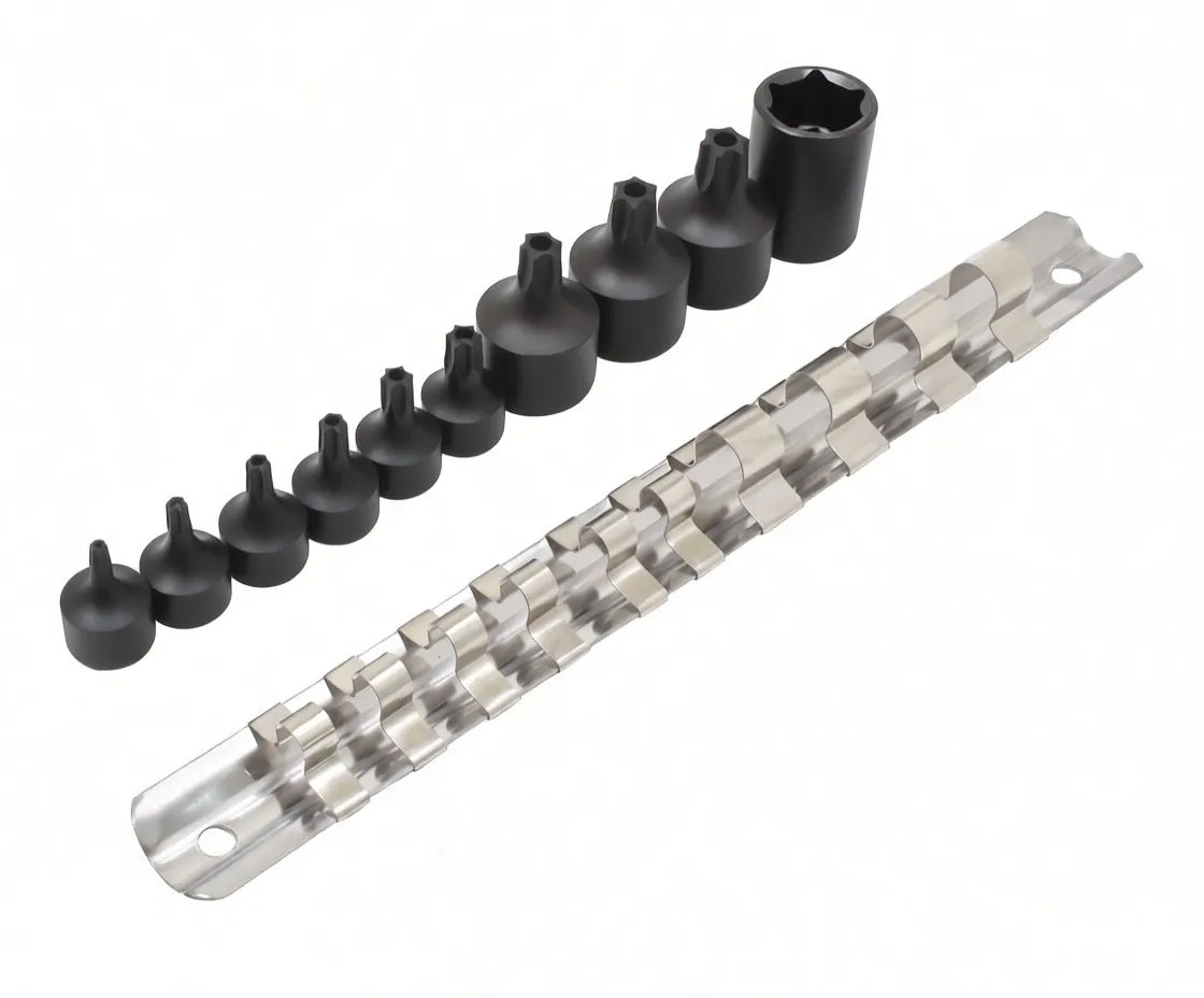 This is a complete 1/4-inch drive Torx socket set designed specifically for working with security-pin Torx fasteners. The eight-piece kit covers the most common tamper-resistant Torx sizes (TX8 through TX40) and comes organized in a durable black plastic rail holder—ready for shop use or resale. Each socket features chrome-plated finish with a knurled grip section for comfortable manual handling. If your customers work with security electronics, automotive body panels, or tamper-resistant assembly work, this set is essential. For shops requiring larger format security fasteners, heavy-duty 1/2-inch drive impact Torx sockets are also available.