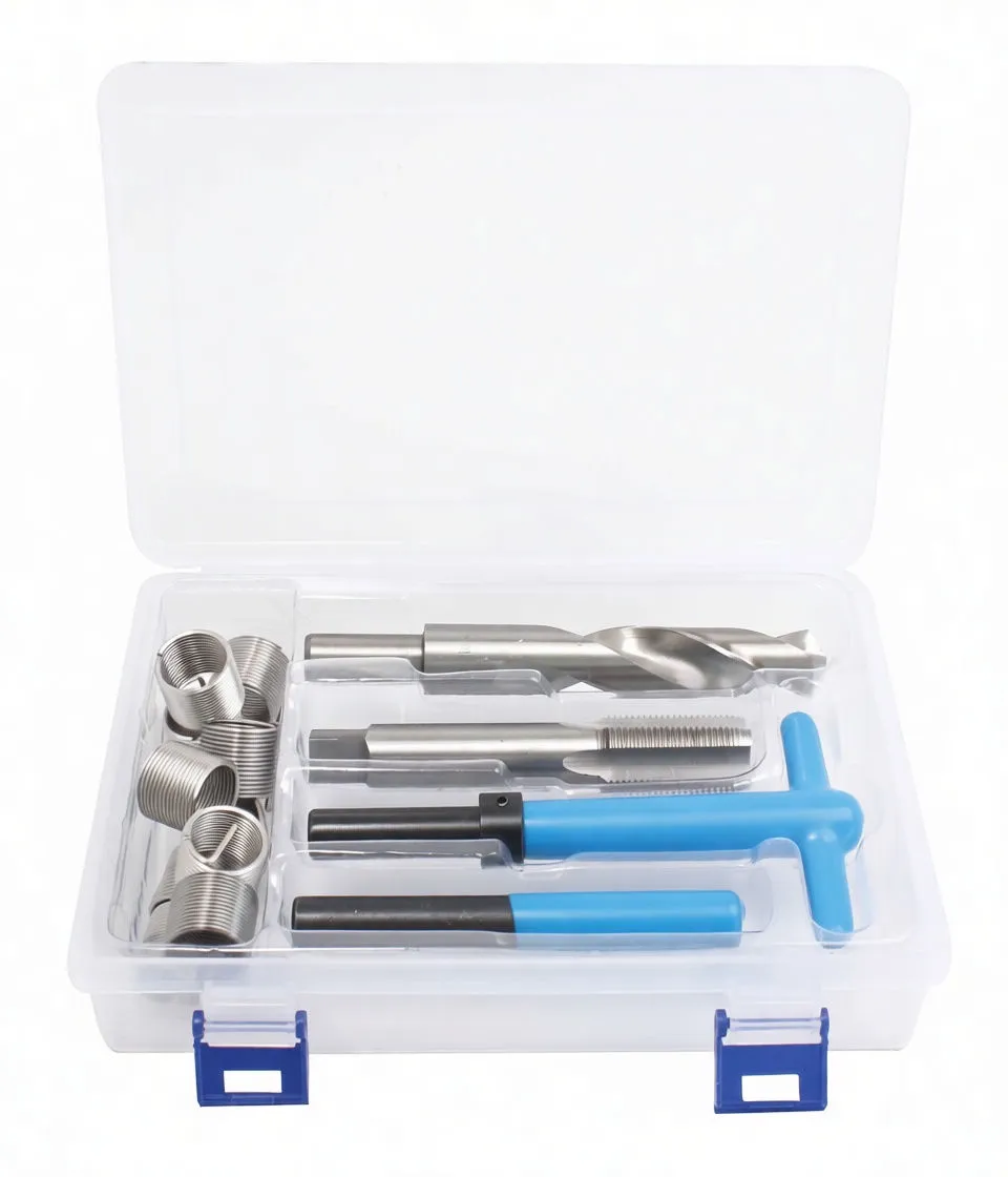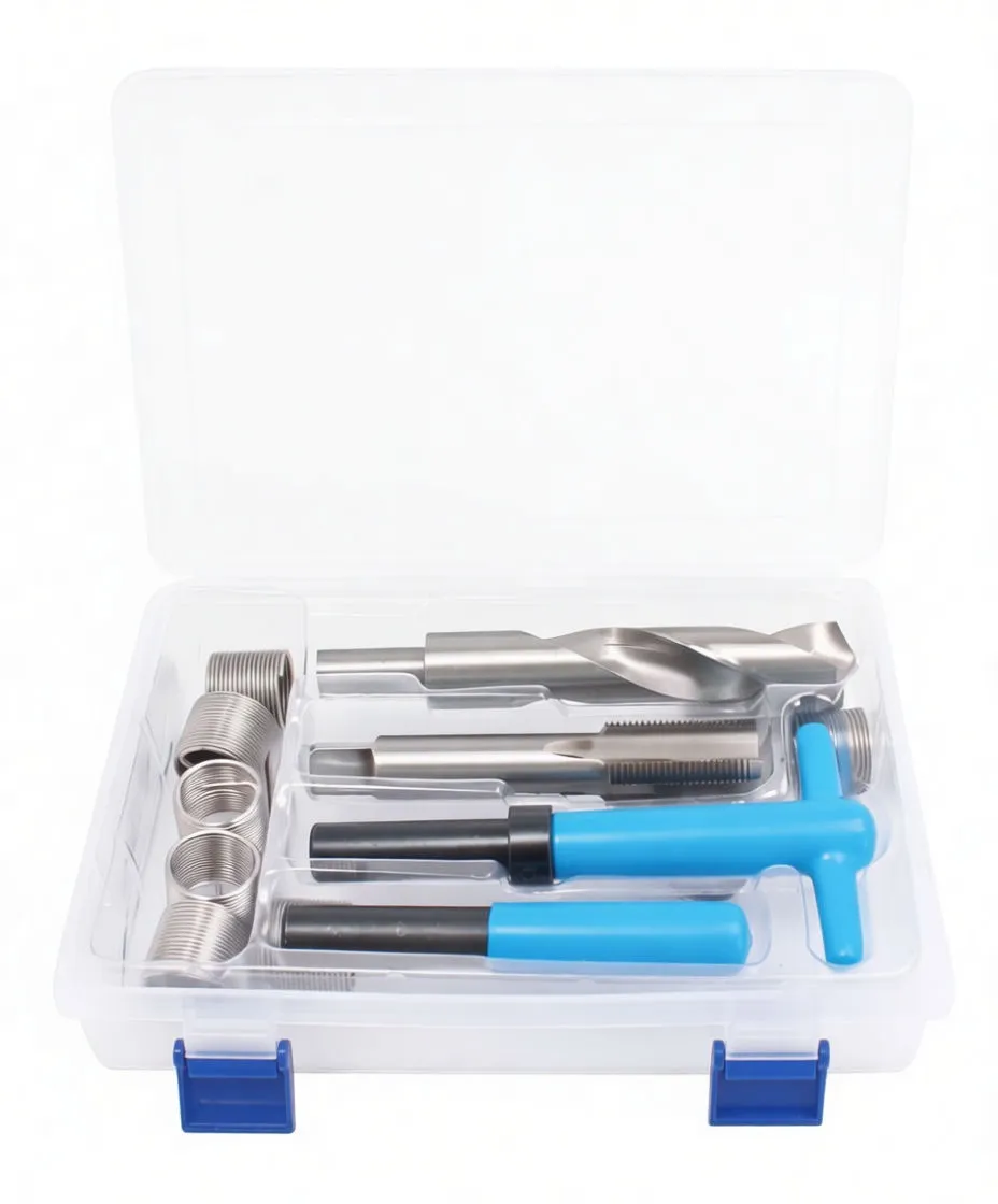 Complete thread repair kit with 5 metric sizes, HSS tools, and 125 stainless steel inserts. Essential for automotive, industrial, and agricultural applications.