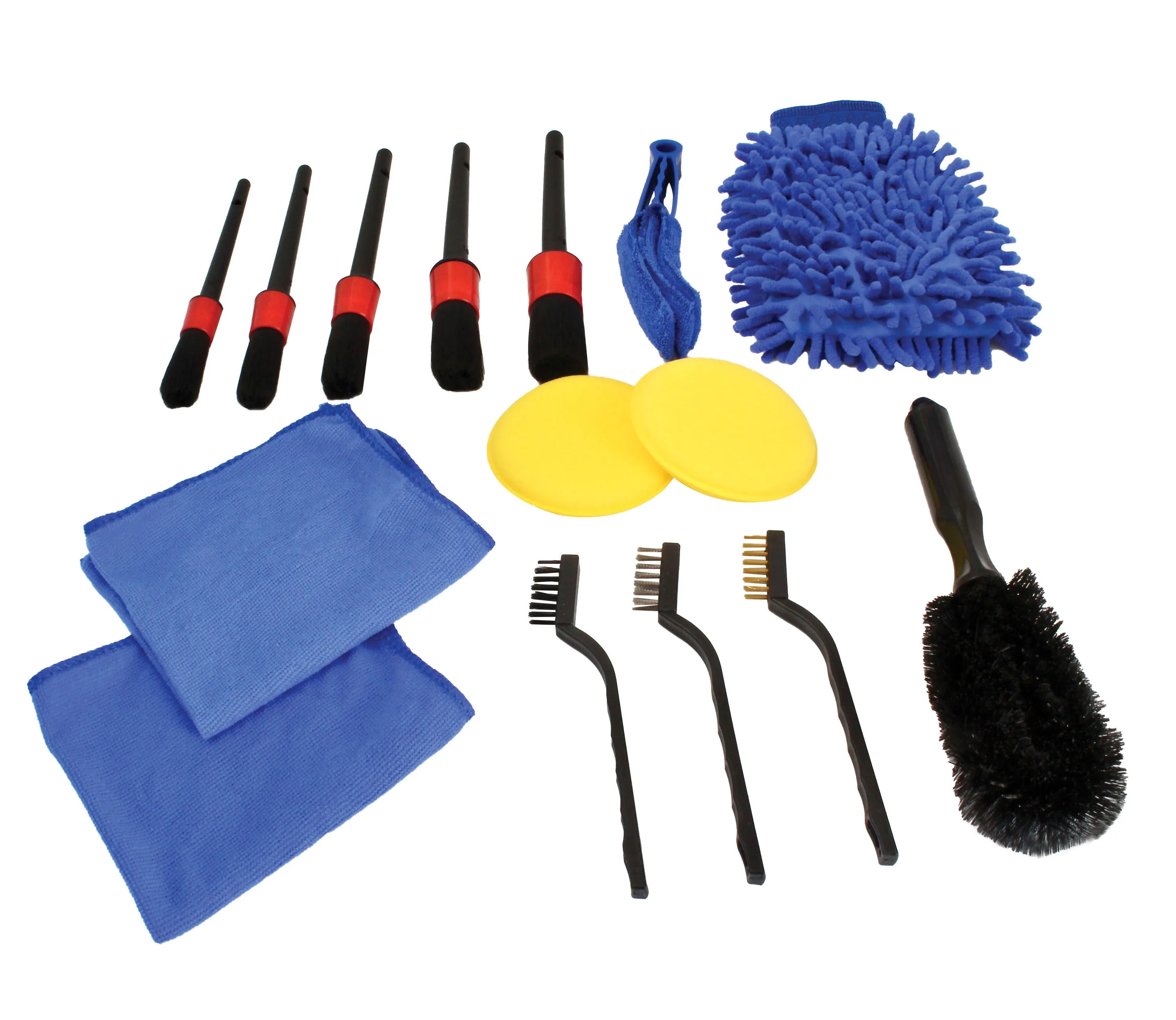 This 15-piece car cleaning kit provides a professional-grade solution for detailing both interior and exterior surfaces. The set combines specialized brushes for different cleaning tasks—from wheel wells to dashboard vents—alongside microfiber cloths and foam applicators. Whether you're stocking a car care retail section or bundling with automotive wash supplies or motorized drill attachment systems, this kit delivers practical value for car enthusiasts and professional detailers alike.