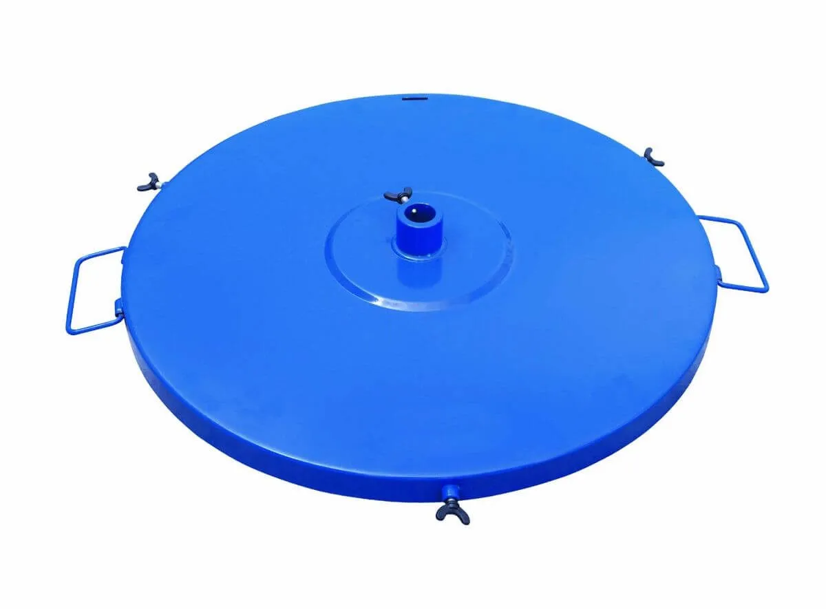 Steel drum cover for 350mm openings with secure clamping system, central pour spigot, and ergonomic handles.