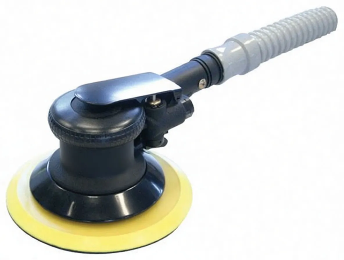 Air-powered oscillating sander with compact design, ideal for precision finishing, detail work, and confined spaces in automotive and woodworking applications.