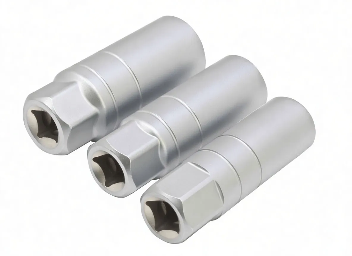 - Dual External Grip Extractors: Two chrome socket-style adapters (7.7mm and 6.8mm internal diameter) with corresponding tapered collets for gripping intact or partially intact plugs