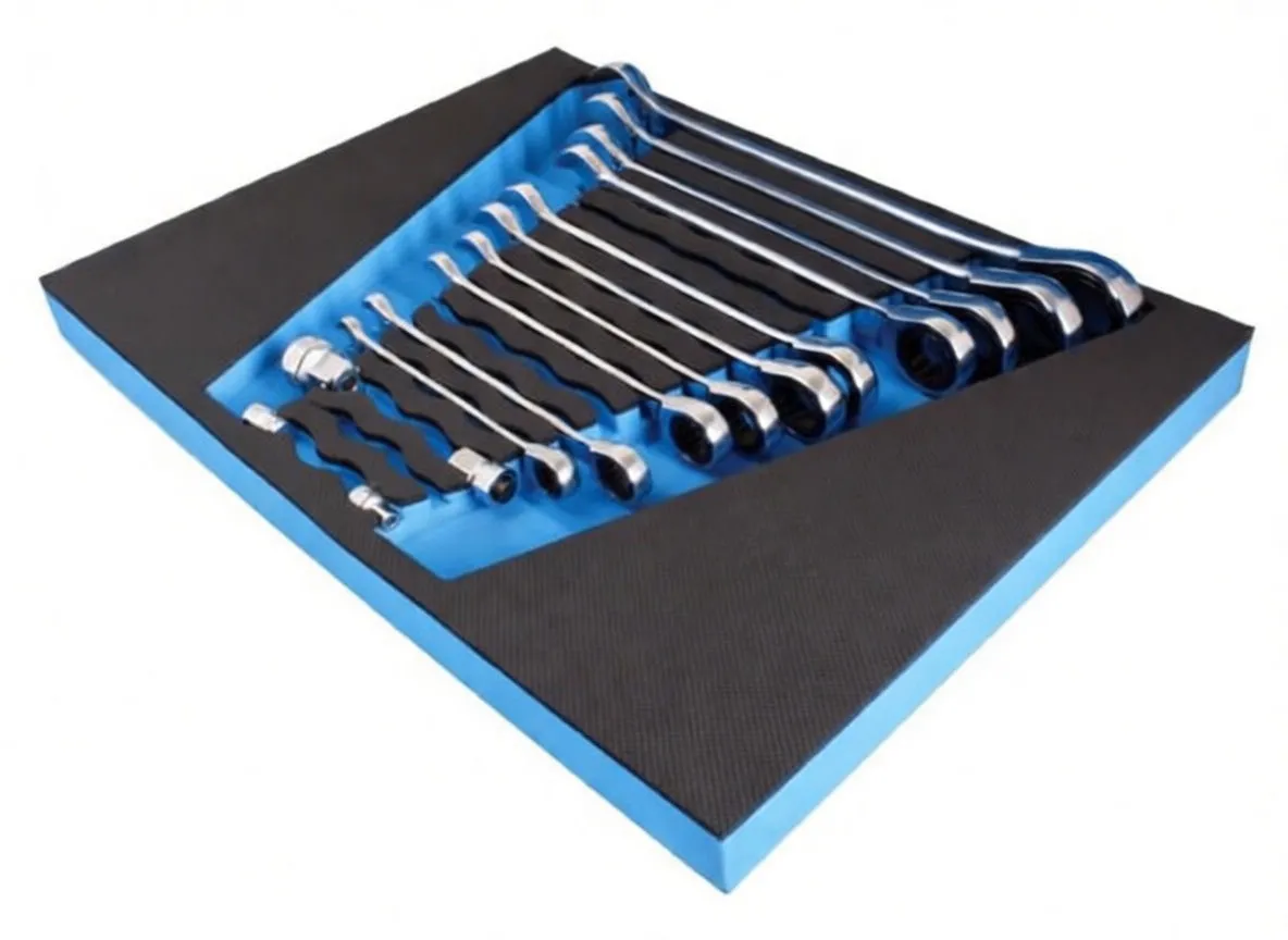 Durable foam insert with pre-cut cavities for 1/4-inch and 1/2-inch sockets, extensions, bits, and hand tools. Oil and dirt resistant.