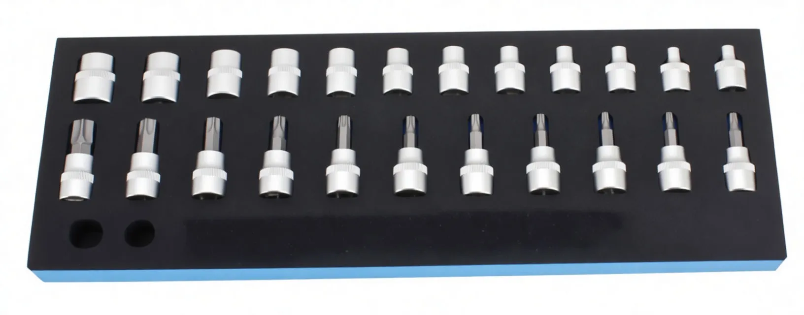This foam tool tray insert is engineered for professional workshops and service departments that demand organized, accessible tool storage. Designed to fit standard toolbox drawers, it accommodates a comprehensive range of socket sizes, extensions, bits, and hand tools in dedicated cavities. The two-tone construction with precision-cut recesses ensures every tool has its place, reducing setup time and preventing damage from tool contact.