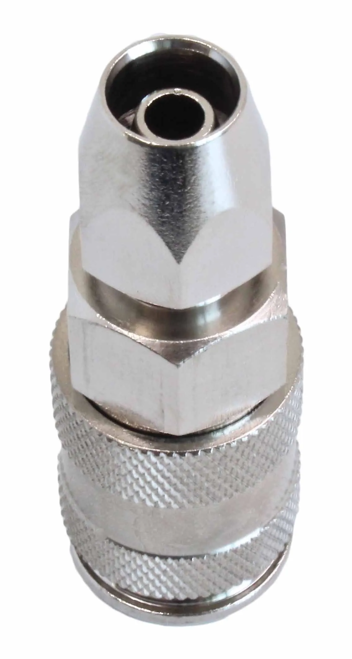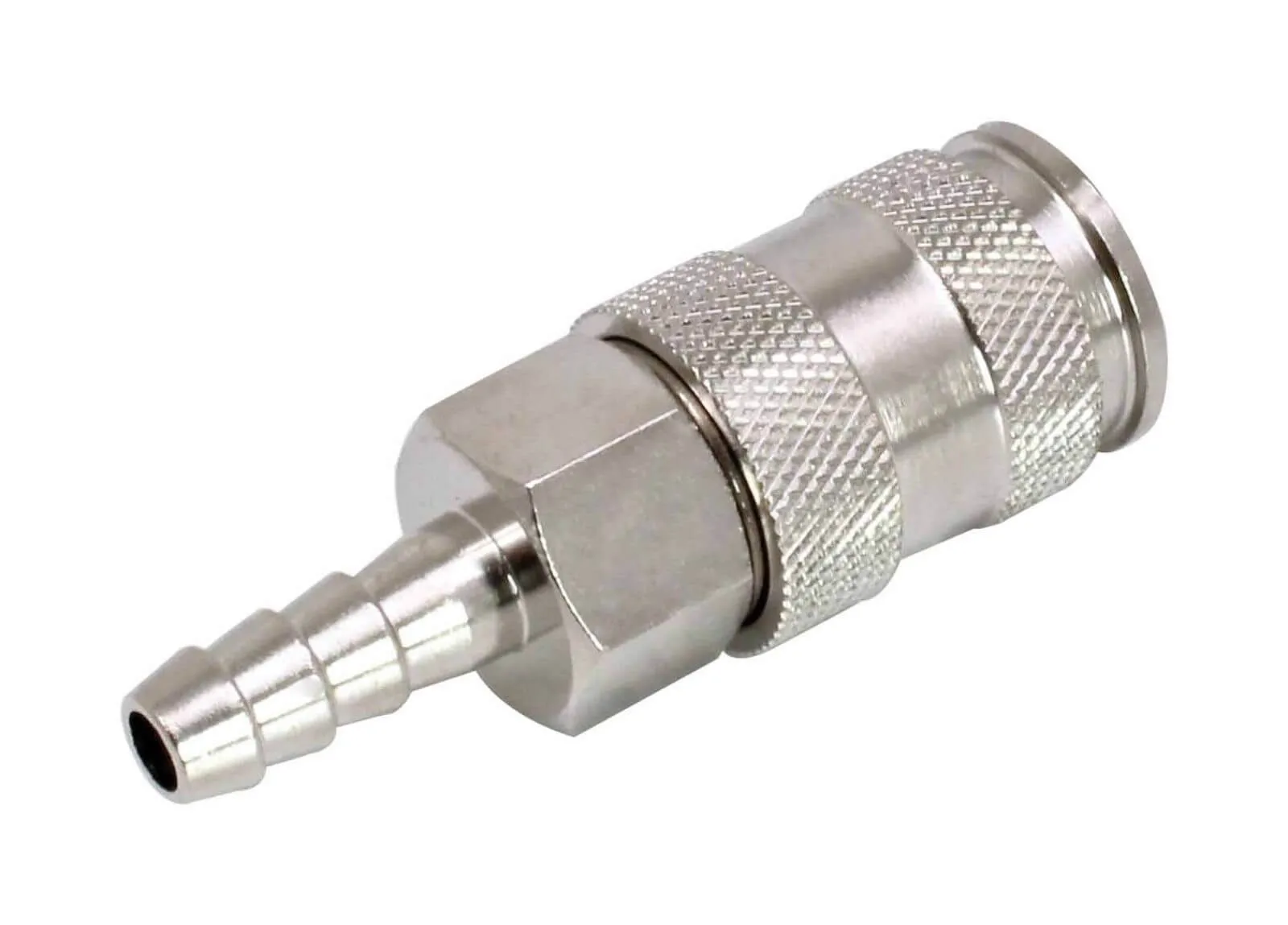 Professional-grade quick-connect coupling with 6mm barbed hose tail for pneumatic and fluid systems. Nickel-plated finish with knurled grip sleeve.