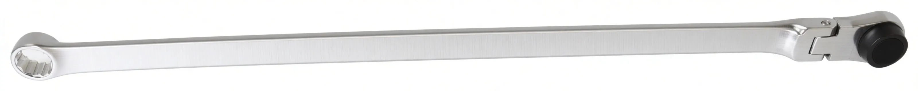 This extra-long ring ratchet spanner is engineered for technicians who need to access fasteners in tight or recessed locations where standard-length tools cannot reach. The 350mm extended handle combined with a swivel ratchet head creates exceptional reach and articulation—critical for engine bay work, exhaust systems, and suspension assembly. Pair this with complementary double-ring wrenches to build a complete reach-access toolkit for your shop.