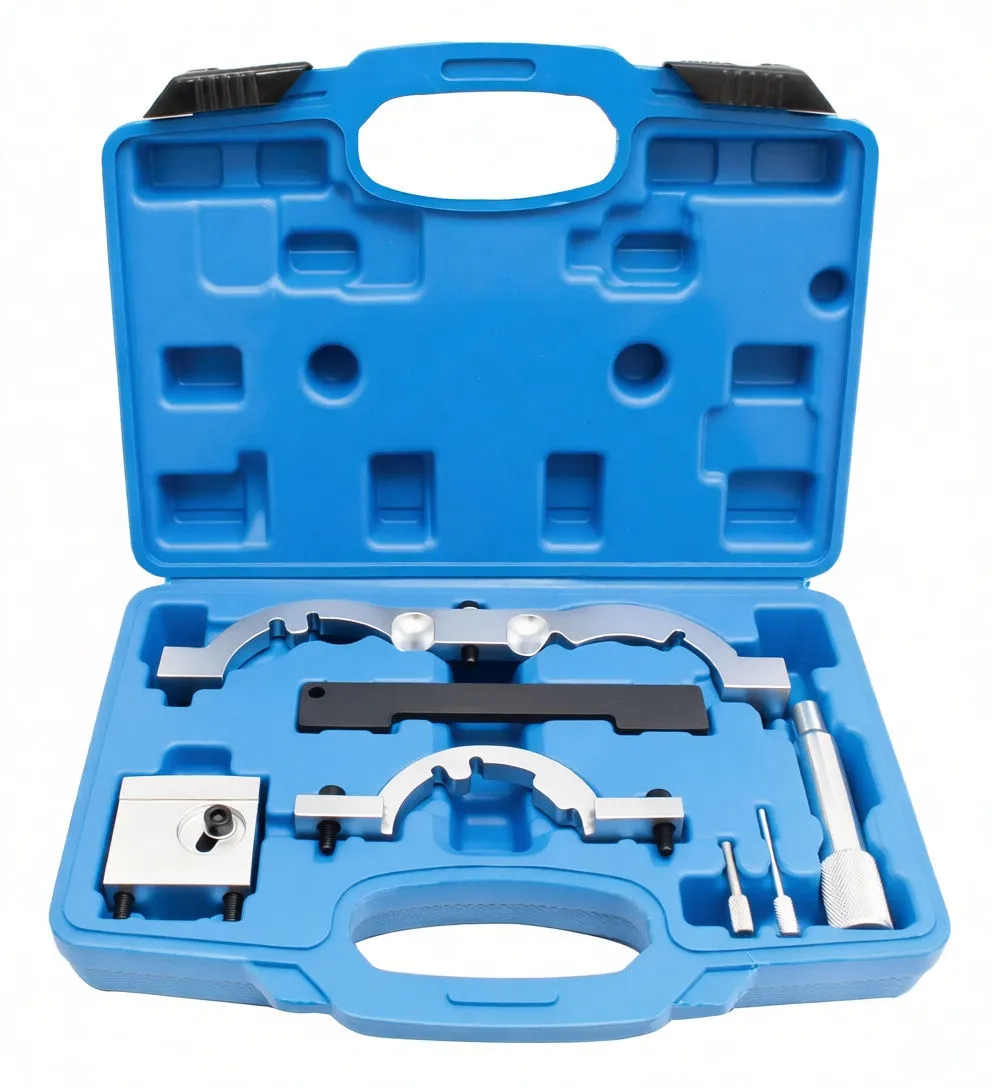 | Tool Composition | Precision-machined black steel alignment bar; chrome-plated L-shaped bars; ribbed polymer locking blocks; machined camshaft bracket; steel locking pins |