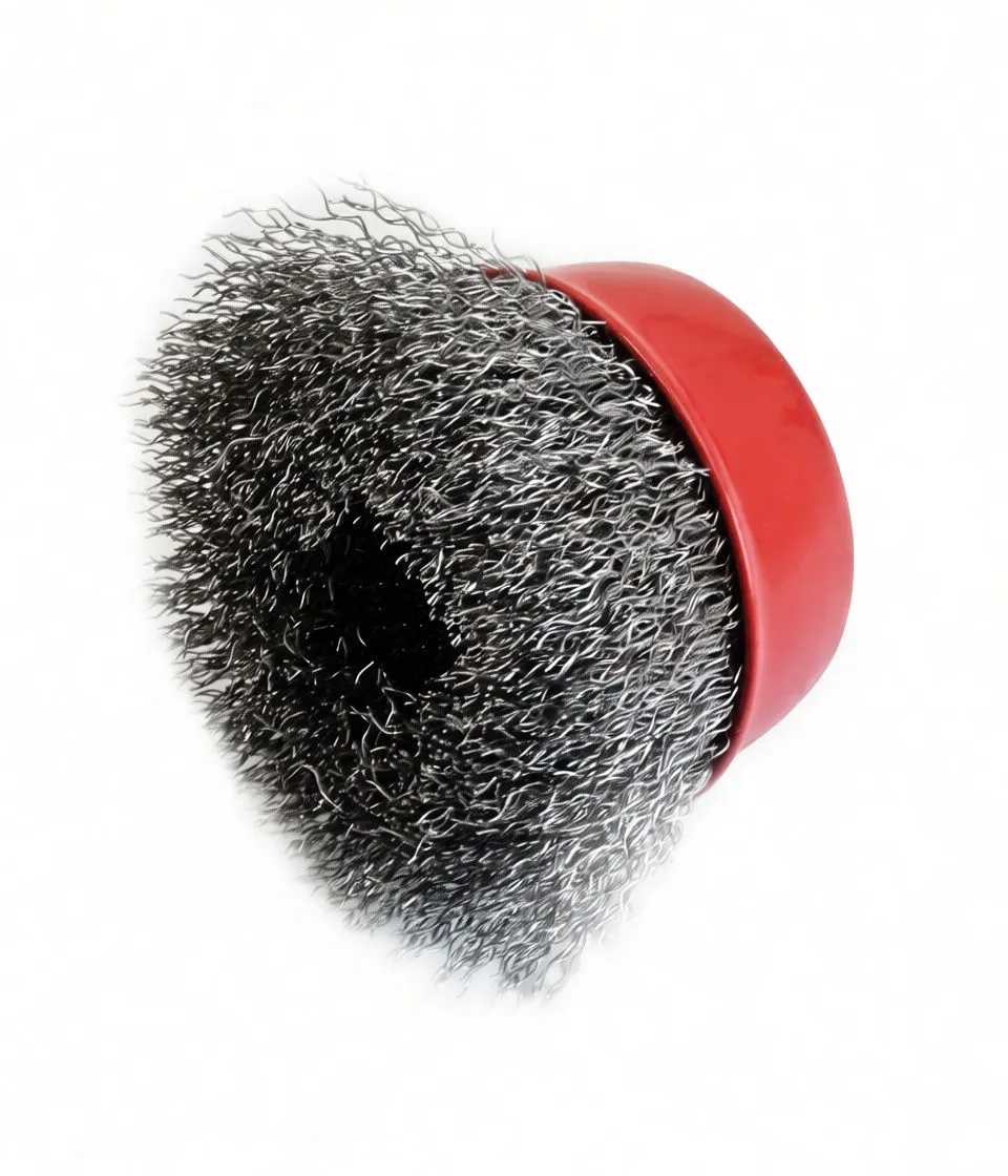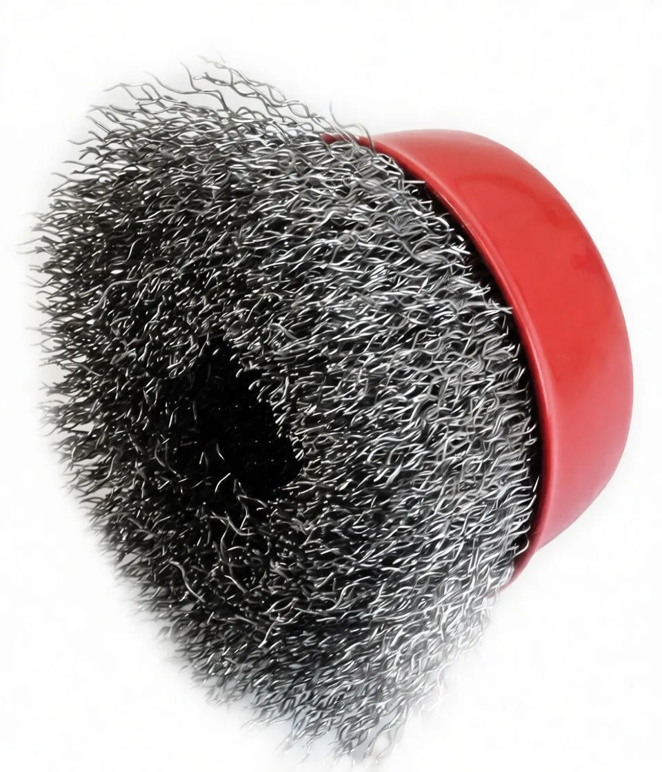 Heavy-duty twisted steel wire cup brush for rust removal, deburring, and surface cleaning on angle grinders and rotary tools.